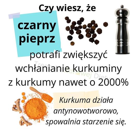 Zawsze dodawaj pieprzu. Piperyna zawarta w pieprzu ułatwia przechodzenie kurkuminy przez ścianę jelit do krwiobiegu. Dodatkowo pieprz może spowolnić rozkładanie kurkuminy przez wątrobę, co automatycznie zwiększa jej stężenie we krwi.